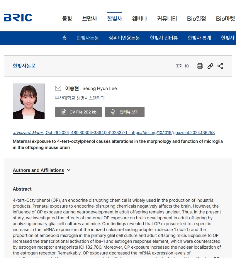- 신경발달 시기 옥틸페놀 노출이 에스트로겐 신호전달 경로를 통해 성체 자손마우스의 미세아교세포의 형태 및 기능에 지속적인 악영향을 미치는 것을 확인함.